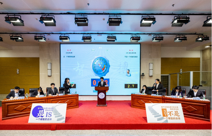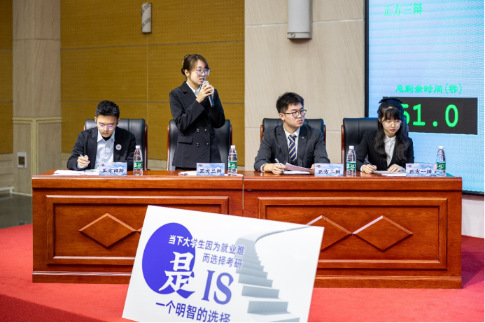 决赛中,双方辩手围绕“当下老员工因为就业难而选择考研是/不是一个明智的选择”这一辩题进行激烈讨论。是因为本科就业难就逃避就业转去考研,还是为了提升自己寻找人生的意义与方向而考研?正反双方围绕自己的立论为老师和同学们带来了一场精彩绝伦的视听盛宴。且看你来我往,针锋相对,字字珠玑,引得在场观众掌声连连。