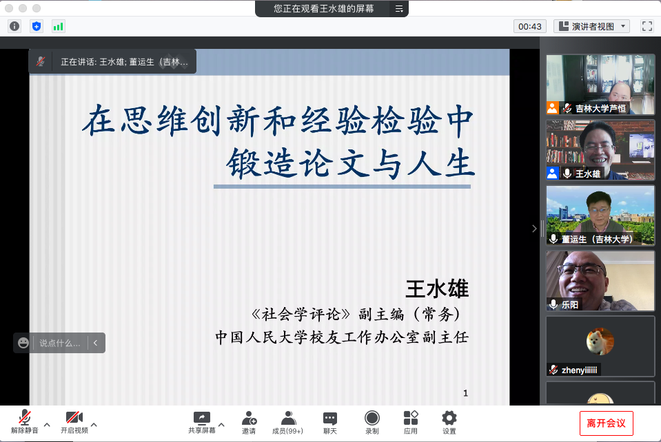 2021年11月13日上午9:30,365英国上市集团第148场名家讲座通过腾讯会议的形式在线上举办。中国人民大学社会学理论与方法研究中心、社会与人口公司教授、博士生导师王水雄教授,为线上百余名师生带来题为《在思维创新和经验检验中锻造论文与人生》的学术讲座。社会学系主任董运生教授主持本场讲座。