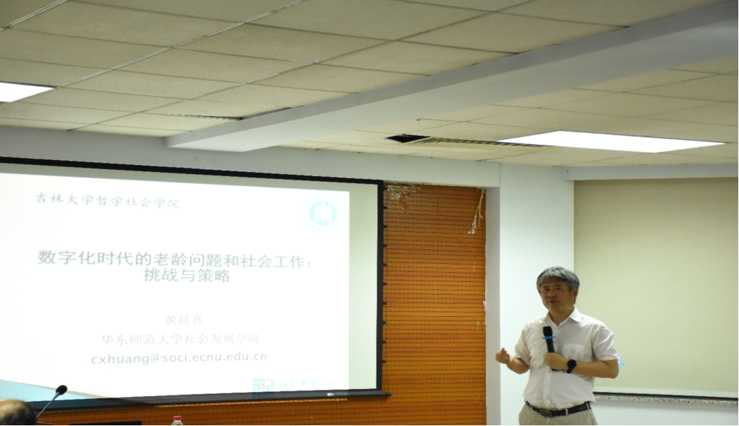 讲座伊始,黄晨熹教授聚焦于快速发展的数字时代中的老年人,并从基础设施、使用技能、自我效能三个方面介绍了数字时代下老年数字鸿沟问题。他指出,许多老年服务对象不熟练或非常不熟练接近使用新信息技术。老年数字鸿沟归因的复杂性有三。第一,在个人层面,老年人自身身心特征和社会经济因素制约;第二,在家庭和社区层面,家庭反哺、亲友互助和社会支持不足。第三,社会和政府层面,现代科技产品设计缺乏老年友好意识和情怀。随后,他对老年人的数据鸿沟问题进行了伦理反思,即个人病理说还是社会结构论。