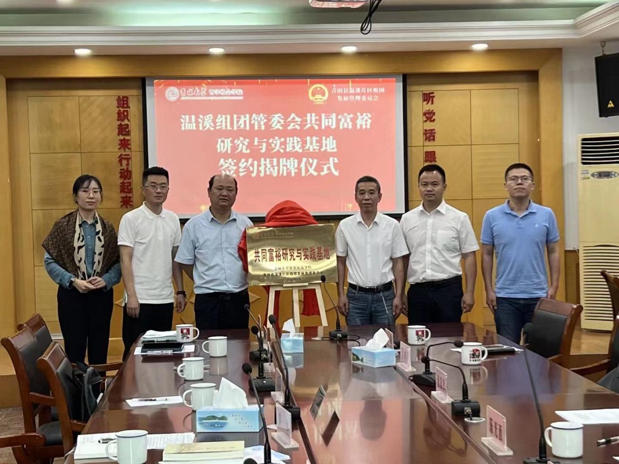6月29日,学院与“青田县温溪片区组团发展管理委员会”(简称温溪组团管委会)共同签署合作备忘录,365英国上市集团“共同富裕研究与实践基地”正式落地温溪镇,双方将携手共同探索实现小城市发展带动周边乡村实现共同富裕发展路径。青田县委常委、温溪组团管委会主任、温溪镇党委书记童森军主持仪式。公司副经理芦恒教授、温溪组团管委会常务副主任陈光西分别代表双方签订基地合作备忘录。公司党委副书记兼副经理刘培强、温溪组团管委会主任童森军共同为共同富裕研究与实践基地揭牌。