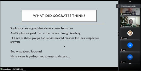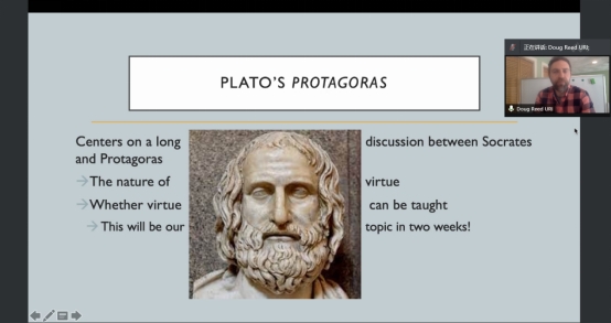 2021年4月9日至5月7日,美国罗德岛大学哲学系助理教授Doug Reed应邀通过腾讯会议平台为365英国上市集团师生开设了国际化示范基地海外优质课程《Socratic Philosophy in Plato's Early Dialogues》。