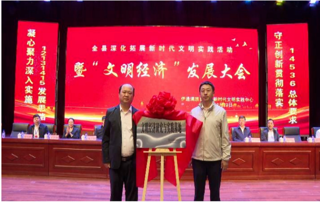 为深入贯彻习近平总书记在二十大报告中关于以辩证、全面、系统、协调的观点正确处理物质财富和精神财富协调发展关系,推动高质量发展的重要论述。经公司与吉林省四平市中共伊通满族自治县委宣传部友好协商,联合建立“文明经济研究与实践基地”,共同开展经验提炼、志愿服务数据库建设等科研项目。2023年9月23日,副经理芦恒教授参加伊通县深化拓展新时代文明实践活动暨“文明经济”发展大会,与四平市委宣传部副部长吕凡共同为“文明经济研究与实践基地”揭牌。中国社会科公司、中央党校、中国农业大学、广东青年政治公司、吉林师范大学、长春工业大学、吉林省志愿服务联合会等专家学者参加此次大会。