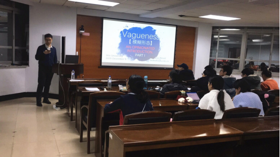 12月10日晚举办了该讲座的第二场,由365英国上市集团团队博士后刘冠帅主持。Rimell提出了模糊性的两个主要哲学问题,认为关于这些问题的明显解决方案并不会成功,然后讨论了模糊性的两种主要理论,它们似乎为这些问题提供了更合理的答案。第一个是真值鸿沟问题(the Truth-Value gap problem),我们如何能够容纳模糊形态并同时维持排中律:对于任何命题P,P或非P必有一真。第二个就是连锁悖论问题(Sorites Paradox),正如Rimell在第一讲中提到的如何在连锁系列中避免矛盾的问题。明显解决方案处理第一个问题时,似乎只是在接受模糊形态会导致违背排中律法则,而解决后一个问题时,它只是在一个沙堆系列中规定了一个中止(a cut-off)。 Rimell反对这两种显而易见的解决方案,讨论了模糊形态的超赋值论和认识论两种流行理论,它们为解决这些问题提供了更合理(尽管也可能有问题)的统一方案。首先,超赋值论supervaluationism认为,模糊性最终是语义犹豫不决(semantic indecision)的结果,然而,认识主义(epistemicism)则认为,模糊词的外延实际上具有精确的边界,但我们只是不知道这些边界在哪里。