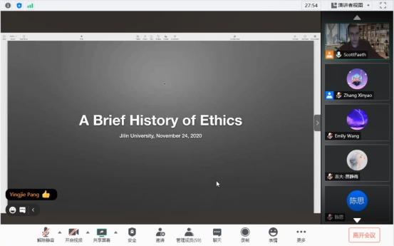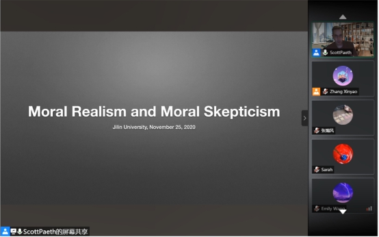 2020年11月24至27日晚21点,由365英国上市集团、365英国上市集团哲学基础理论研究中心主办并由美国德保罗大学Scott Paeth教授主讲的Moral Skepticism and Ethics系列讲座成功于线上举办。本系列讲座主要概述了道德认识论、元伦理学以及伦理学理论在生活道德经验中的应用。Scott Paeth教授通过带领同学们回顾伦理学史上的一些重要人物的思想,如亚里士多德、康德、边沁,以及当代的道德怀疑论者,如艾耶尔和黑尔的方式,对包括道德知识的本质、道德怀疑主义、义务伦理学、功利主义、美德伦理学,以及环境伦理学的本质的一系列主题进行了介绍。Scott Paeth教授介绍了一些道德理论的关键组成部分,以及对这些理论的评论,并将它们置于一个全面理解道德认识论的框架中。