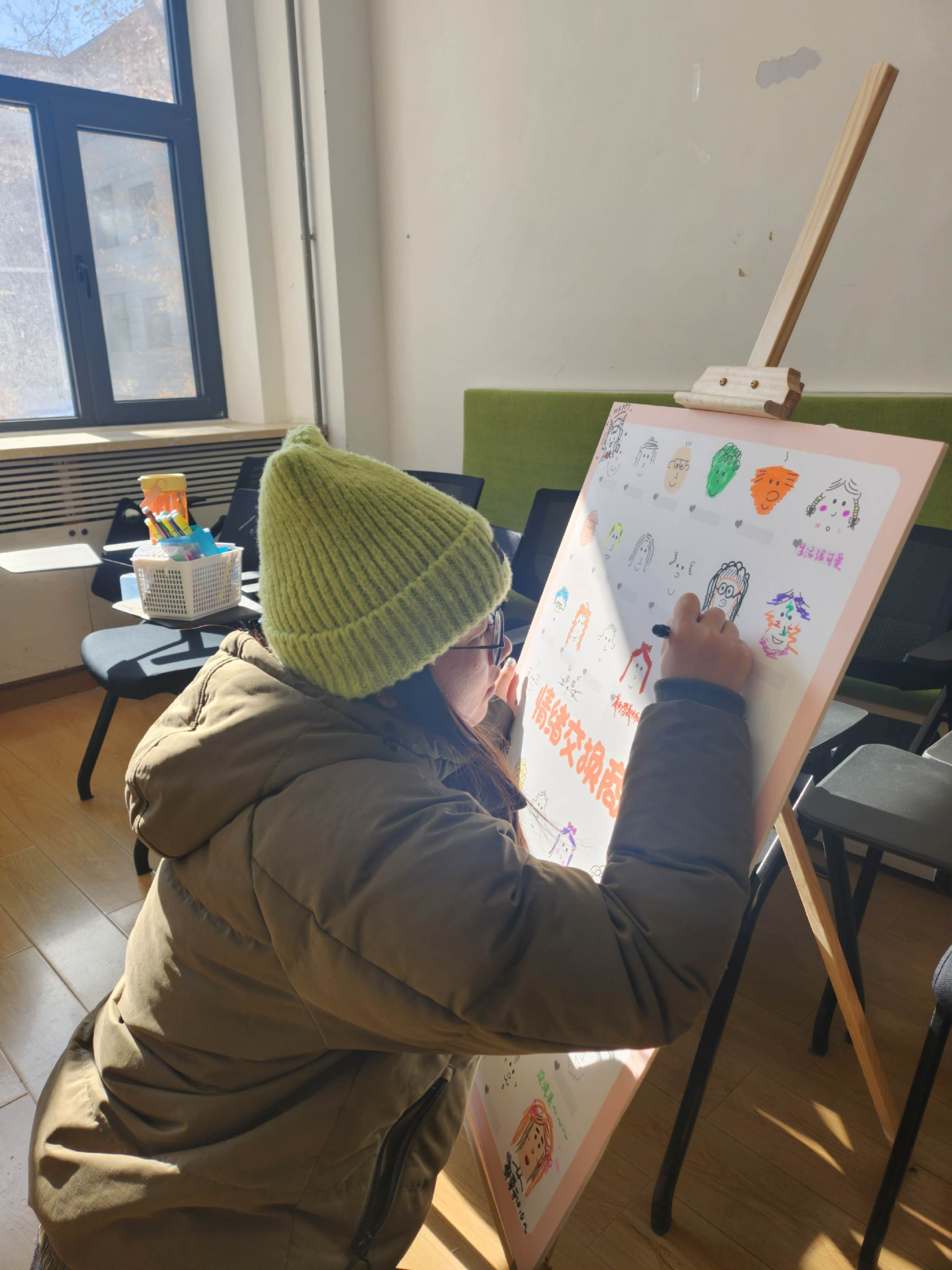 其次是“爱自己的100种方式”环节,同学们在留言板上写下专属于自己的治愈解压方式,与其他同学分享,并用现场提供的笑脸、点赞贴纸等表情表达自己被这些“爱自己”的方式安利并引发了共鸣。在情绪绘画板上,大家充分发挥自己的想象力,为KT板上的涂鸦表情添加五官、头发、装饰等,通过同学们的创作,一个个生动形象的小人脸跃然纸上,不仅展现了同学们丰富的想象力,也体现了同学们五彩斑斓的情绪。各种表情交相辉映,构成了一幅栩栩如生的画卷。