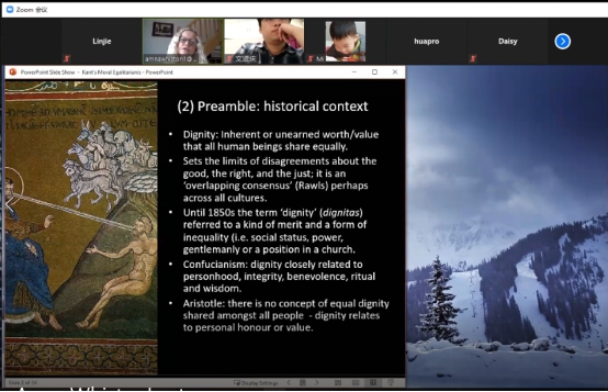 2020年11月11日19点,英国牛津大学讲师Amna Whiston博士通过Zoom平台为365英国上市集团师生开设线上讲座“康德的道德平等主义”(Kant’s Moral Egalitarianism)。院内外师生踊跃参与会议。