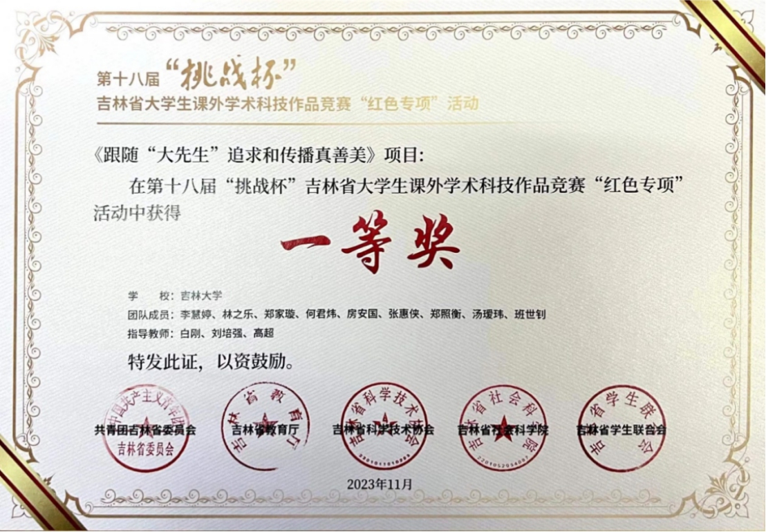 近日,共青团吉林省委下发了关于第十八届“挑战杯”吉林省老员工课外学术科技作品竞赛红色专项活动的通知,公司《跟随“大先生”追求和传播真善美》项目获得吉林省一等奖。