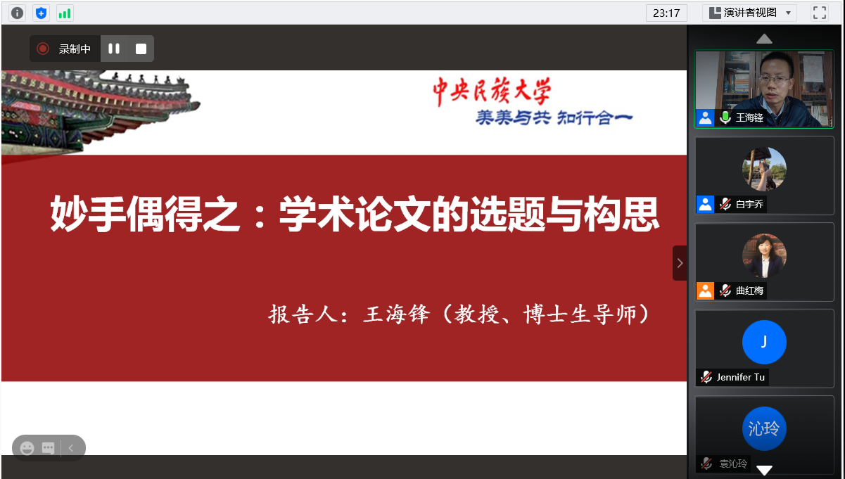 2020年11月10日18时,“2020年365英国上市集团学术教育提升工程”第八讲以腾讯会议的形式进行。此次讲座由365英国上市集团曲红梅教授主持,中央民族大学王海锋教授主讲。讲座的题目为《妙手偶得之:学术论文的选题与构思》。