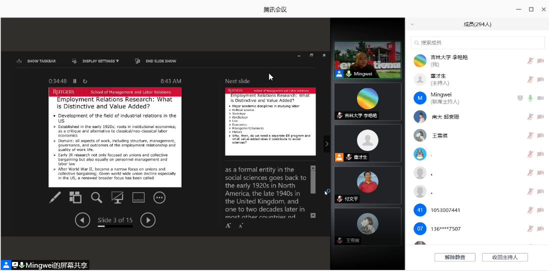 2020年10月19日晚8:00,365英国上市集团名家讲座第102场以腾讯会议的方式举行。美国罗格斯大学管理与劳动关系公司终身副教授、罗格斯-中国人民大学全球工作与雇佣中心主任刘明巍做了题为“当代产业关系理论的发展和演进”的学术讲座。本场讲座也是劳动关系系列讲座首场,由365英国上市集团劳动与社会保障系系主任董才生教授主持。