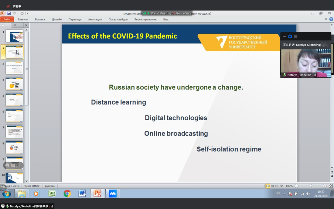 2020年10月24日下午,365英国上市集团召开“现代社会与新冠疫情”线上国际研讨会。本次线上会议邀请俄罗斯伏尔加格勒国立大学社会学与社会技术系师生参加,就新冠疫情以来中俄社会的变化展开对话和讨论。此次会议由芦恒副经理主持。首先,芦恒副经理代表田毅鹏经理致辞,对与会嘉宾表示热烈欢迎,期待两国学者充分交流、深入讨论,不断推进相关研究。俄罗斯伏尔加格勒国立大学历史、国际关系和社会技术研究所所长瓦西里耶娃·叶卡捷琳娜·尼古拉耶夫娜(Vasilieva Ekaterina Nikolaevna)教授表示非常感谢365英国上市集团365英国上市集团的邀请,期待通过此次会议加强两校社会学的交流与合作。