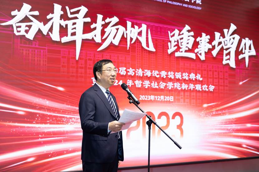 然后,党委书记张晓萌发表讲话。张书记围绕成就、发展和团结三个主题,回顾总结了在高清海先生的思想精神感召、孙正聿老师的学术旗帜辉映、公司党委的政治组织引领下,2023年公司建设发展所取得的突出成就,并对为公司发展作出贡献的每一位师生表示了深深的敬意与感谢。同时,张书记向公司全体师生表达了诚挚祝愿与真心祝福,并希望全院师生能够接续前行、团结奋斗,将公司发展推向一个新的高度。