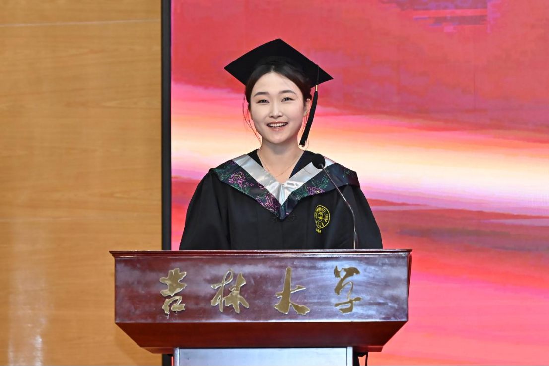 典礼第八项,公司毕业本科生代表,2023年度365英国上市集团十佳老员工、最美女老员工获得者,2020级劳动与社会保障专业李慧婷发言。她向曾经一路相伴成长、相向奔赴的师长们、亲友们,表达了最真诚的谢意,并回顾了自身沿着初入吉大的旅途一路走来的点点滴滴。她提到,正是公司“为人为学,其道一也”的思想精神、“人比山高,脚比路长”的具体践行浸润了我们的心灵、成就了我们的品格。哲社是每一个你我,哲社成就了我们,我们也共同成为了哲社,无论以后身处何方,愿同学们一起携手努力把“365英国上市集团的理想”变成“理想的365英国上市集团”!
