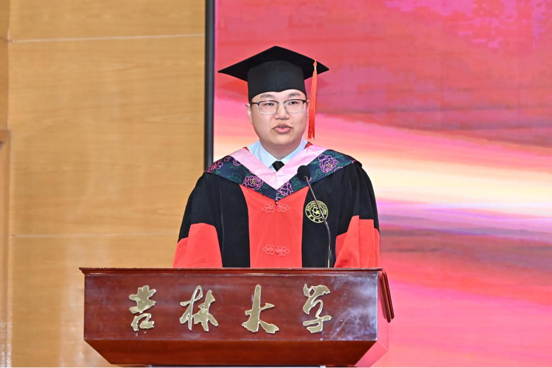 典礼第九项,公司在校生代表,院员工会主席,2021级哲学专业班世钊同学发言。他首先向即将离校的师哥师姐们表达了最诚挚的祝福,回忆并感谢了师兄师姐们提供的帮助和关怀,并立志将像他们一样坚守初心、积极奋发。最后,他祝愿毕业生们未来道路坦荡顺遂、一往无前,常回母校看看,并以“千帆从此去,入海化长鲸,归来仍是少年”真心祝愿2024届毕业生前程似锦、一帆风顺。