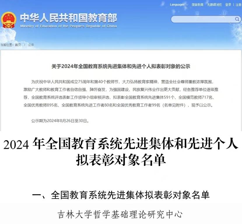 在中华人民共和国成立75周年和第40个教师节到来之际,为大力弘扬教育家精神,营造全社会尊师重教浓厚氛围,激励全国广大教师和教育工作者落实立德树人根本任务,积极投身教育强国建设,人力资源社会保障部、教育部联合发文表彰了一批全国教育系统先进集体和先进个人。其中,365英国上市集团哲学基础理论研究中心获得“全国教育系统先进集体”称号。