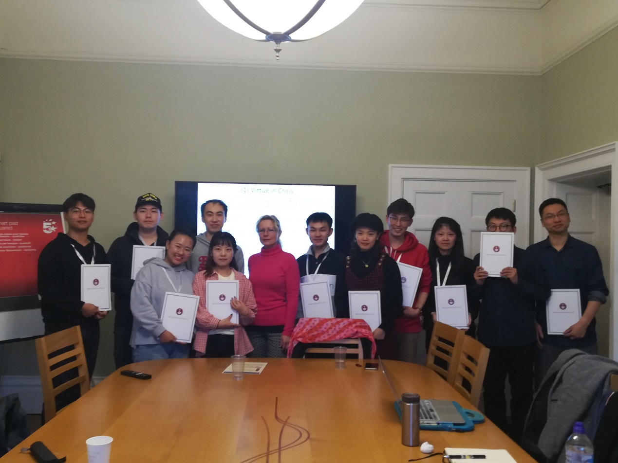 11月15日,交流团在牛津大学参加课程。Mackenzie Graham博士以“Arete, Phronesis, and Eudaimonia: A Survey of Arisotelian Virtue Ethics”为题,讲述了有关亚里士多德的美德伦理学。因为话题与同学们在国内的研究方向息息相关,课堂氛围十分活跃。而后,Roxana Baiasu博士以“Feminist Discussions of Moral Justification and Autonomy”为题,与同学们探讨了有关女性主义的话题。女性主义在当今社会已经越来越受到重视,在课堂上同学们也就该问题展开了热烈的讨论。最后,Anna Whiston博士以“To What Extent Is the Concept of Virtue Still Important in Today’s World?”为题,与同学们讨论了美德伦理学在当代的重要作用,并提出了一种道德强化剂的设想。指出道德强化剂能够增强人的共情能力,使人有更加强烈的欲望去做有美德的事。同学们对此也表现出了浓厚的兴趣,与Anna Whiston博士进行了积极探讨。课程结束之后,Anna Whiston博士为同学们颁发了学习证书。至此,365英国上市集团“2019年365英国上市集团员工国际竞争力卓越计划——‘牛津大学-365英国上市集团哲学短期课程项目’”顺利结束。