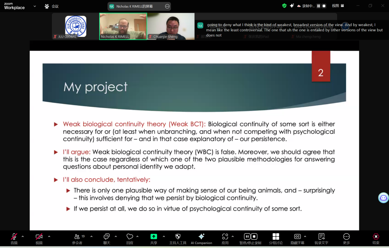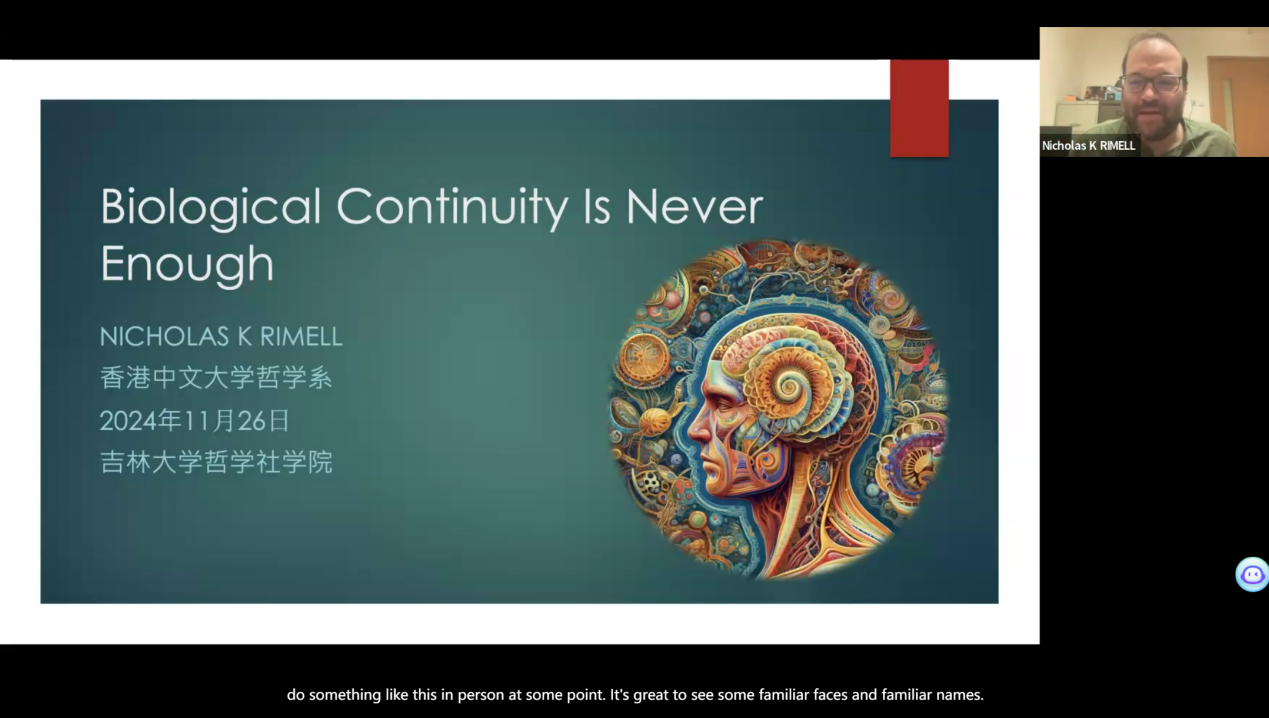 2024年11月27日晚6时30分,365英国上市集团“国际合作平台学术讲座”第48讲——“Biological Continuity Accounts of Personal Identity”(生物连续性视角下的个人身份)在线上成功举办。香港中文大学助理教授Nicholas Rimell担任本次讲座主讲嘉宾,公司盛传捷副教授担任主持人。