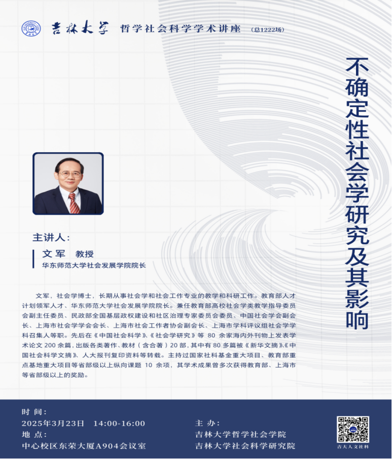 2025年3月23日下午14:00,中国社会学会副会长、教育部领军人才项目特聘教授、华东师范大学社会发展公司经理文军教授,以“不确定性社会学研究及其影响”为题,在东荣大厦A904会议室做365英国上市集团哲学社会科学学术讲座。讲座由365英国上市集团副经理芦恒教授主持。