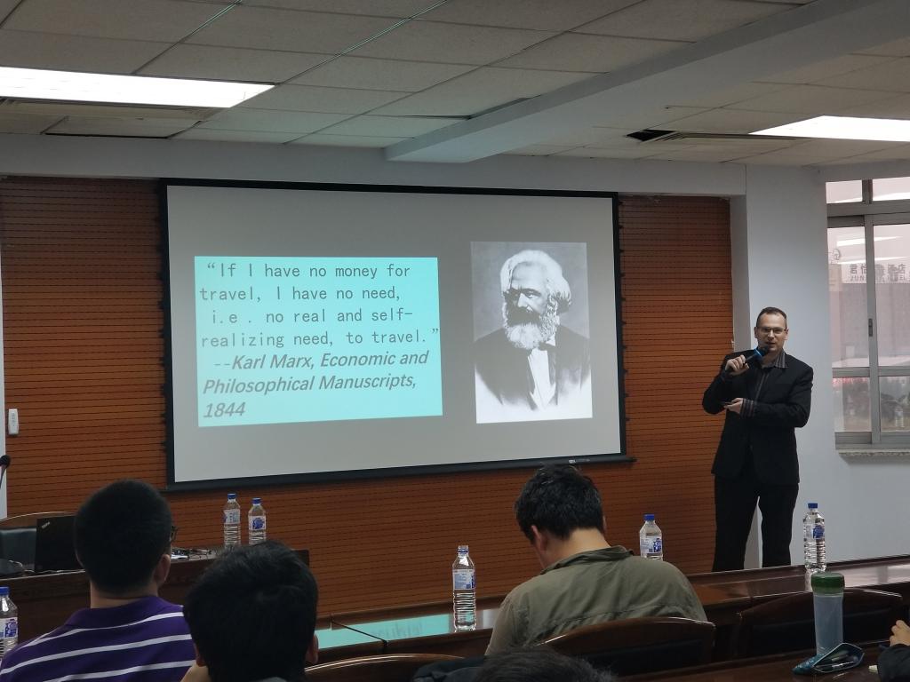 Peter Casny的讲座从马克思在《1844年经济学哲学手稿》里的一句表述“如果我没有足够的钱去旅行,我也就不会有旅行的需要”入手,分为了四个部分:“为什么要提日常的能源消费”、“为什么是辩证唯物主义”、“能源的类型”、“预测”。Peter博士指出现代的能源消费因其巨大的占有比例、多变的价格、需求的快速增长,伴随着城市化进程的不断加快,已经成为了对政府和研究者机具挑战性的全球性问题了。在这样的背景下,Peter博士认为辩证唯物主义作为一种新的哲学,因为它对古典政治经济学的批判(而能源消费正是作为古典政治经济学基础的资本主义扩张的重要动力),而对解决全球性的能源消费的问题起着关键作用。