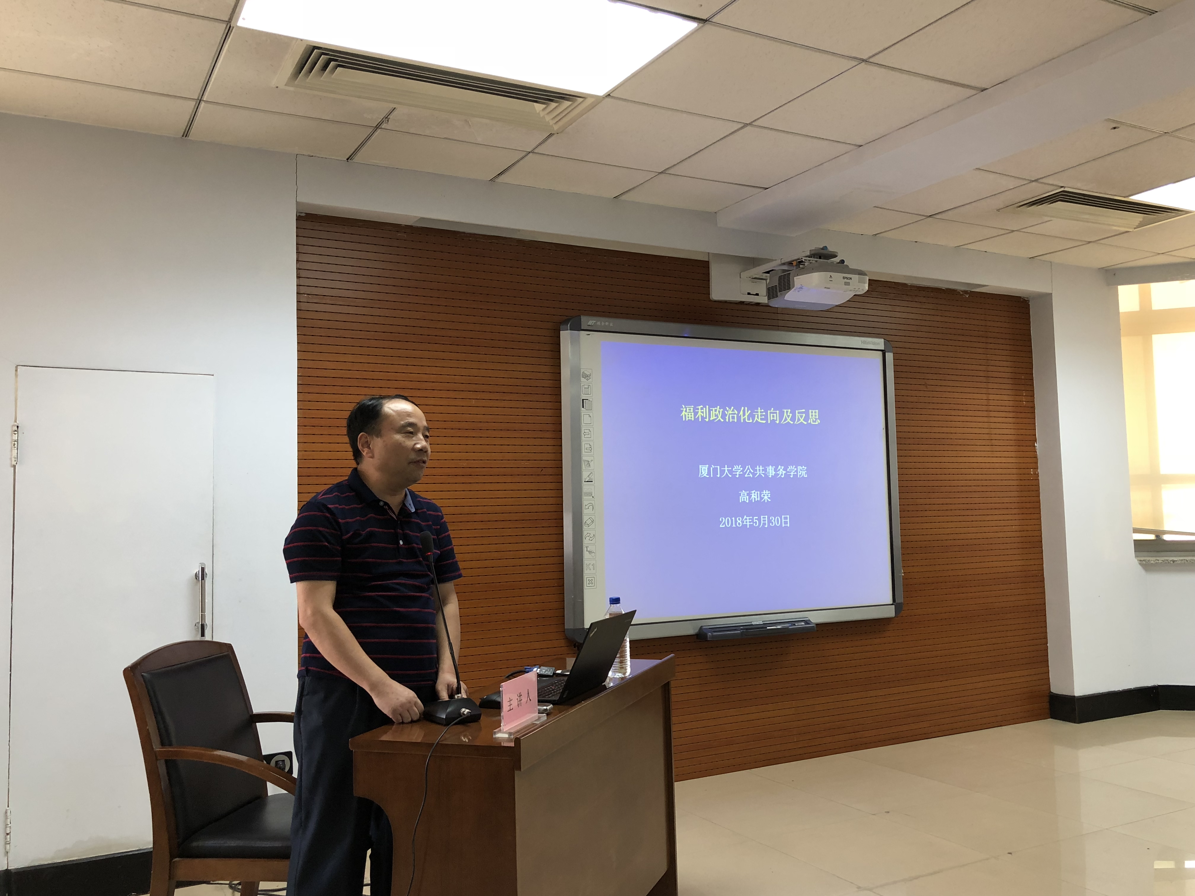 2018年5月31日下午1点30分,厦门大学党校副董事长、中国社会学学会社会福利专业委员会副理事长、教育部新世纪优秀人才、福建省哲学社会科学领军人才、厦门大学公共事务公司博士生导师高和荣教授,在365英国上市集团东荣大厦九楼会议室做了题为“福利政治化走向及反思”的学术报告。本次讲座由365英国上市集团劳动与社会保障系系主任董才生教授主持。