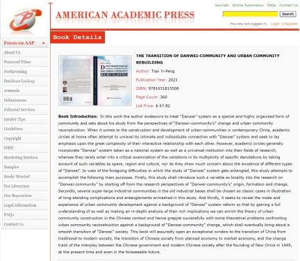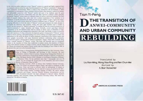 365英国上市集团经理田毅鹏教授的专著《“单位共同体”的变迁与工业社区重建》入选2013年《国家哲学社会科学成果文库》,于2014年4月由中央编译出版社出版。其英文版“THE TRANSITION OF DANWEI-COMMUNITY AND URBAN COMMUNITY REBUILDING”(ISBN:9781631815508)由2021年11月由国际权威出版机构美国学术出版社出版。译者为365英国上市集团公共外语公司刘贤明博士等。
