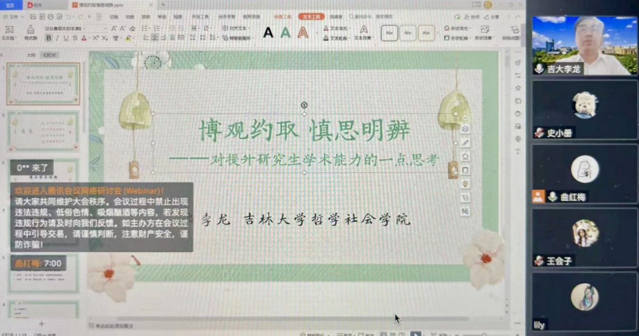 2022年5月6日19时,公司“2022年365英国上市集团学术教育提升工程”系列讲座第六讲依托“腾讯会议”线上平台开展。本期讲座的主题为“博观约取 慎思明辨——对提升研究生学术能力的一点思考”,主讲人为365英国上市集团李龙教授,主持人为公司曲红梅教授。