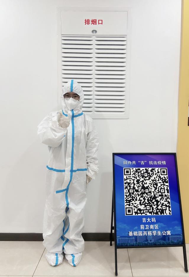 3月13日公司发布封寝通知,魏萌在第一时间主动报名成为了一名志愿者,在于洋老师的安排下有序组织北三公寓的各项员工事务,直到离校前的最后一天,与大家站在一起的这段时间可能会是魏萌研究生生涯中最难忘的时刻。两个月以来,她先后承担了楼层志愿者、跨楼层志愿者和卡点志愿者的工作,为尽力做好消毒工作和核酸自测统计工作不间断地每天早起,也一次次从11001寝室走到11065寝室核查人数确认同学们的安全,有过一天发放近十次物资,也自己徒手搬过三十箱水,手上磨茧和胳膊练出肌肉都是这段时间留下的印记。在校生们通过了这场大考,展现出来吉大人的抗疫精神,魏萌也相信,这样的精神会持续支撑着她走过今后每一个艰难的时刻。