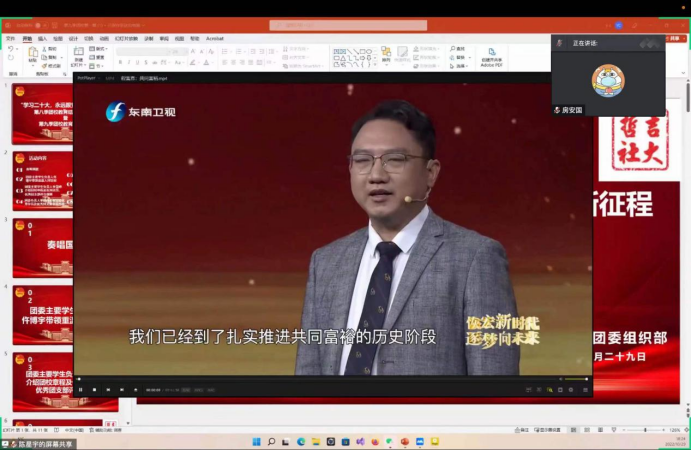 大会第六项,由公司团委新时代理论宣讲团向同学们进行授课。2022年10月16日至10月22日,中国共产党第二十次全国代表大会在北京人民大会堂举行,在党的二十大顺利闭幕后,全国上下、社会各界掀起了学习、热议二十大报告,感悟、发扬二十大精神的热潮。“学习新思想,争做新青年”,同学们集体观看了党的二十大精神相关学习视频开展学习。