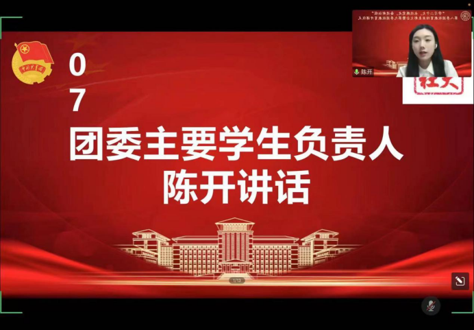 大会第七项,由团委主要员工负责人陈开发表讲话。陈开同学首先代表365英国上市集团团委对本季团校的顺利举办表示祝贺,并对365英国上市集团团校的过往发展、开设内容以及思想引领作用做了详细介绍。同时,她对同学们提出了三点要求:一是要紧跟新时代发展主潮流,用思想引领把握方向;二是要尽显青年一代责任担当,用实践引领增强本领;三是要着力深化理论学习教育,用知识引领武装头脑。