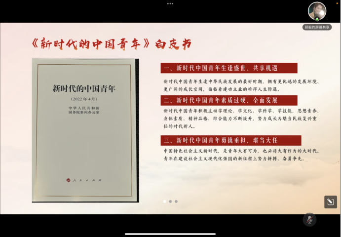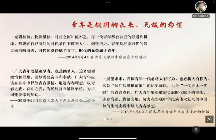 在随后的自由交流环节中,入团积极分子们纷纷就总书记与青年的故事、总书记青年的寄语以及青年应该如何作为进行心得分享。同学们表示,此次课程帮助他们有效梳理了青年在中国共产党百年奋斗中的地位与作用,同时深刻认识到党领导下广大青年取得的巨大成就,在接下来的学习中会继续保持专注度和热情,持续学习,不断奋斗,增强素养。