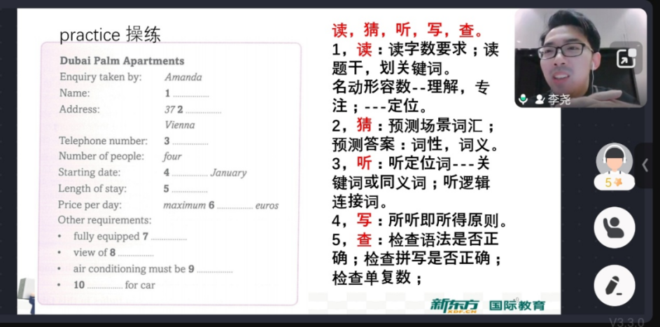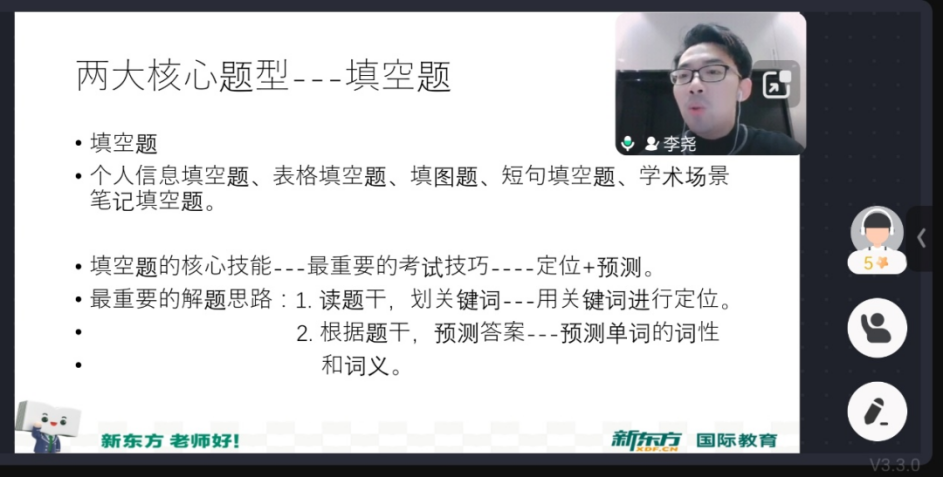 首先,主讲李老师对雅思听力填空题的主要类型进行了划分:个人信息填空题、表格填空题、填图题等,并分别举例,帮助同学们初步了解雅思听力填空题的主要形式。随后,李尧老师介绍了解题思路:依据题干中的关键词,预测答案的词性和词义,并在听力材料中进行定位。