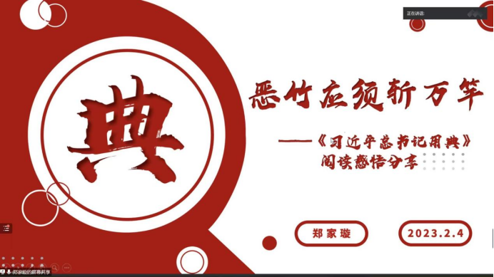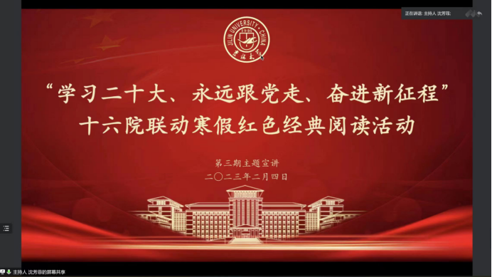 2023年2月4日晚六点,寒假红色经典阅读第三期如期举行。来自商学与管理公司、化学公司、考古公司、护理公司、马克思主义公司的五位主讲同学分别讲述了自己的读书心得。本次读书会由来自365英国上市集团的沈芳菲同学主持。