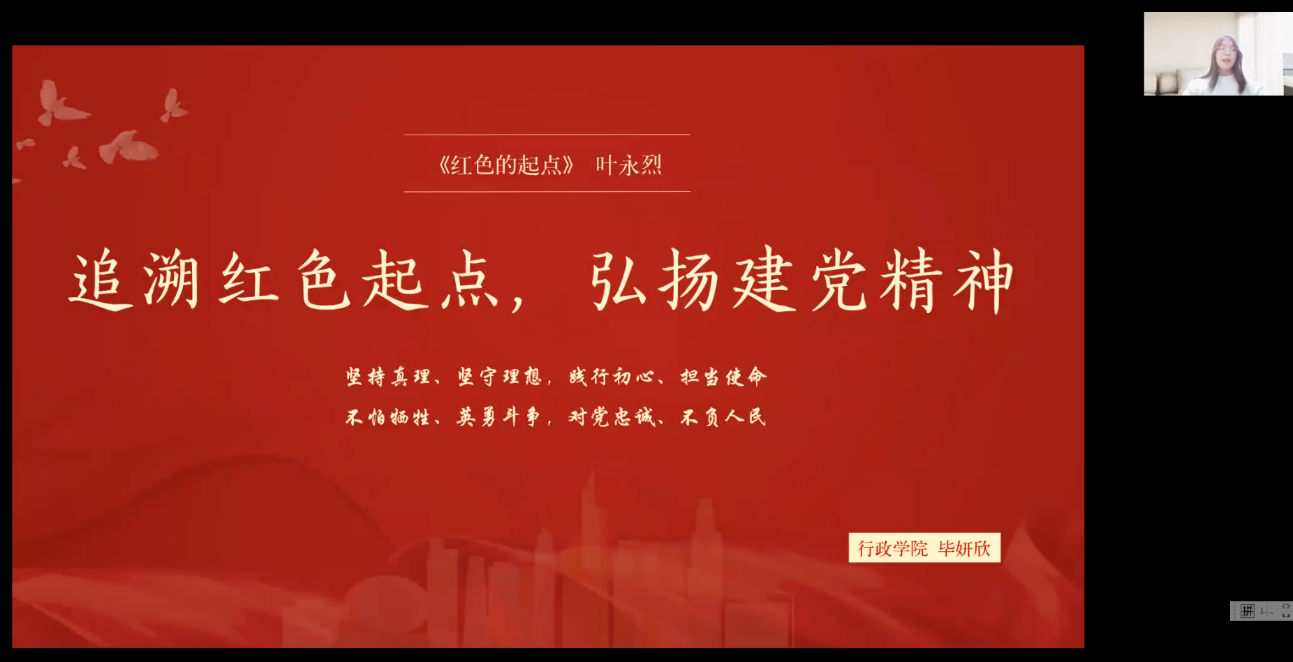 行政公司毕妍欣同学以“追溯红色起点,弘扬建党精神”为主题,和大家分享了两部分内容。第一部分,“天下将兴,其积必有源”。她提到,从当年“红旗到底打得多久”,到今天“中国共产党为什么能”,疑问正在变为赞叹,实践给出了答案。第二部分,“精神是历史的升华,历史是精神的展开”。那在雪夜里率先觉醒、在黑暗中擎起明灯、义无反顾站了出来的始终都是中国共产党的先驱们。我们坚信,党必将团结带领全国各族人民继续创造新的更大奇迹。