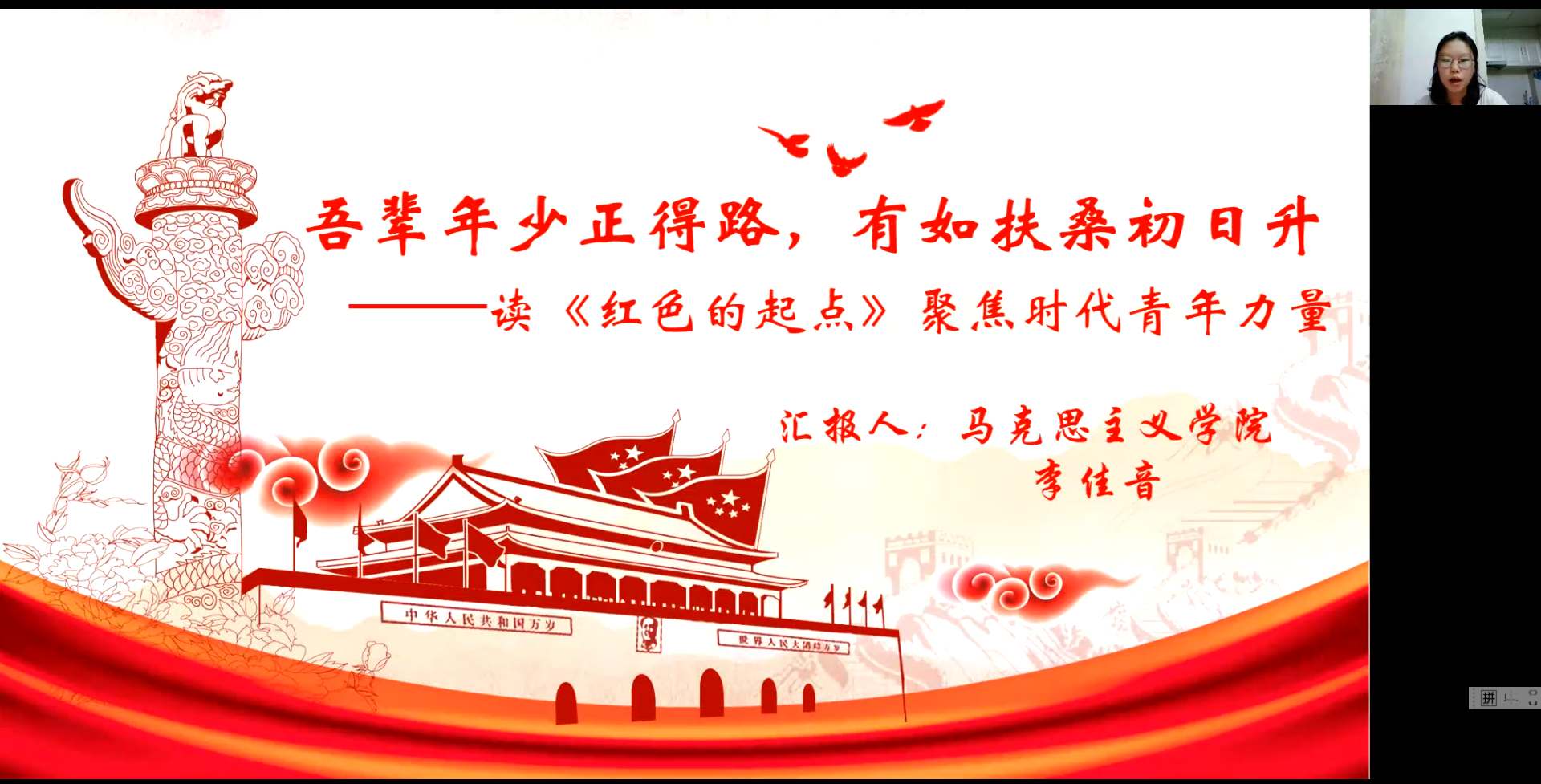 马克思主义公司李佳音同学分享的主题是“吾辈年少正得路,有如扶桑初日升”。她首先对所读书籍做简要概述;然后分享个人阅读感想,她号召大家学习革命先烈有始有终、不畏艰难、心系家国、敢攀高峰的优秀品质。