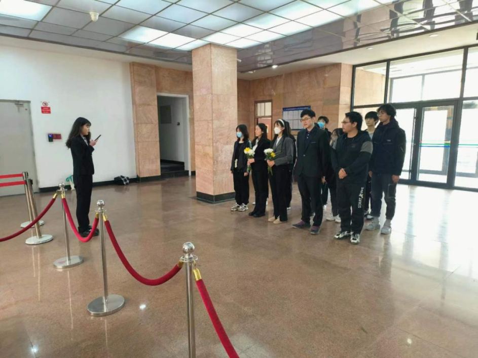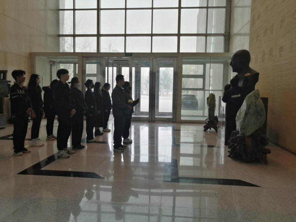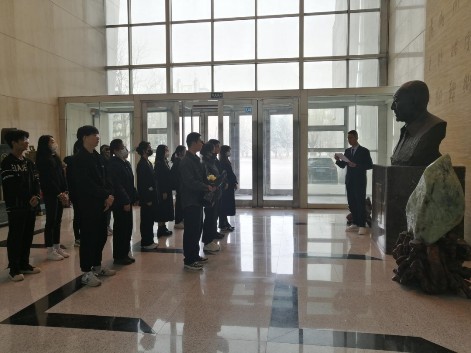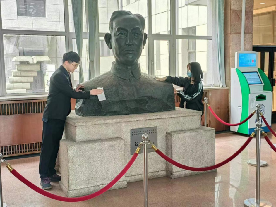 同学们认真聆听着主持人同学们的讲解,仔细感受着从文字中浮现出的学术先贤们的奋斗岁月。随后,员工代表们分别上前擦拭雕塑、献花。