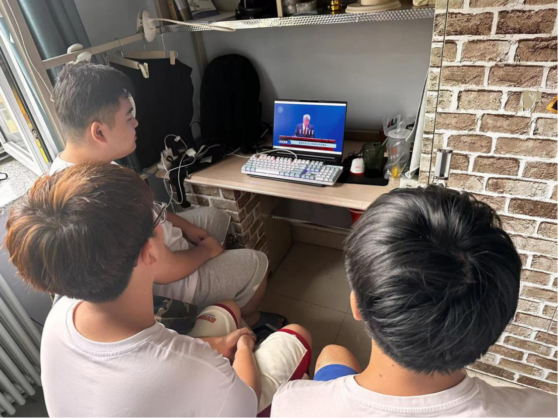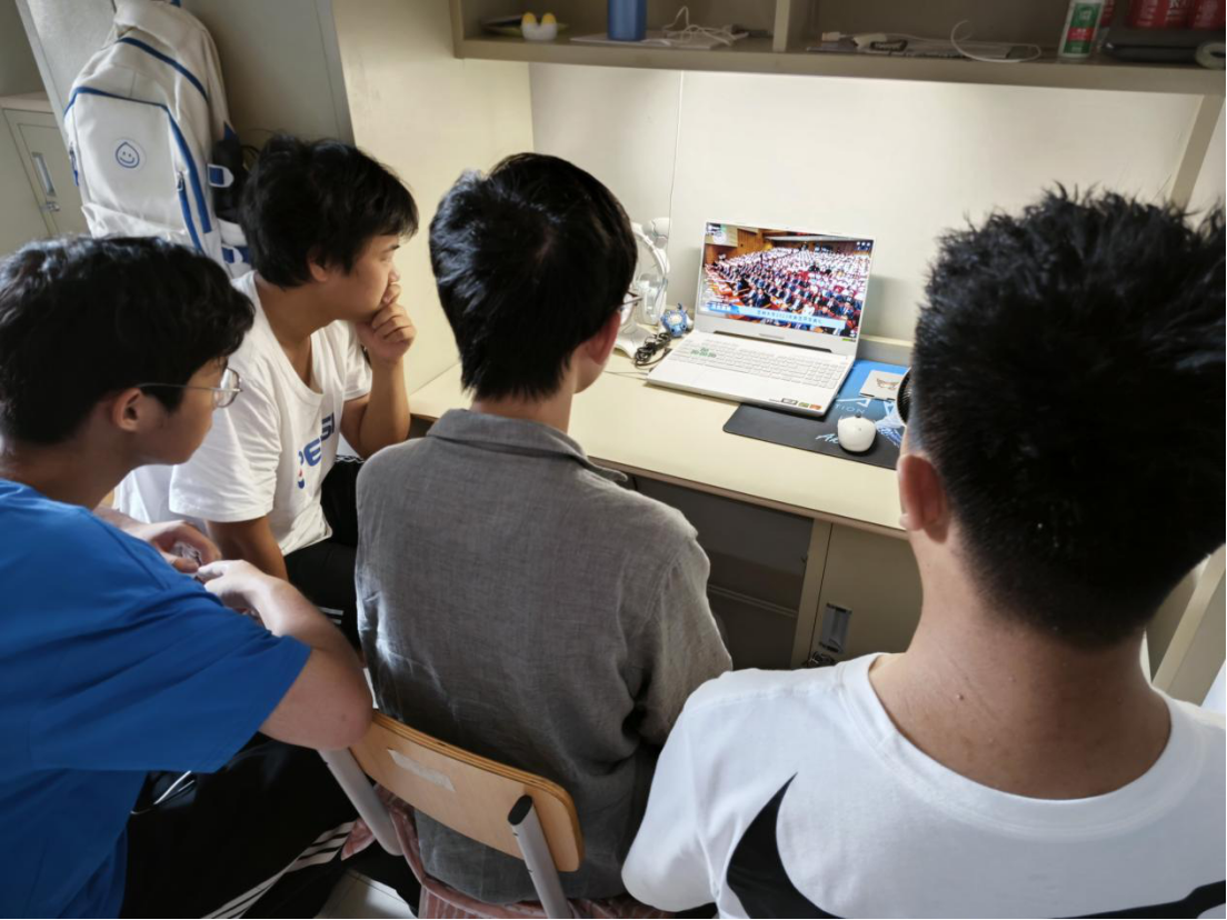 上午九时许,在雄壮激昂的国歌声中,开学典礼正式拉开帷幕。公司学子面貌昂扬、精神集中,在屏幕前认真观看现场直播。