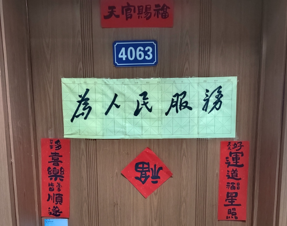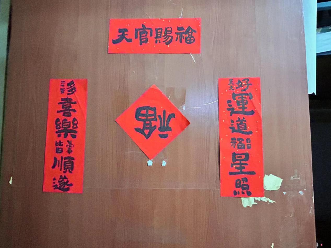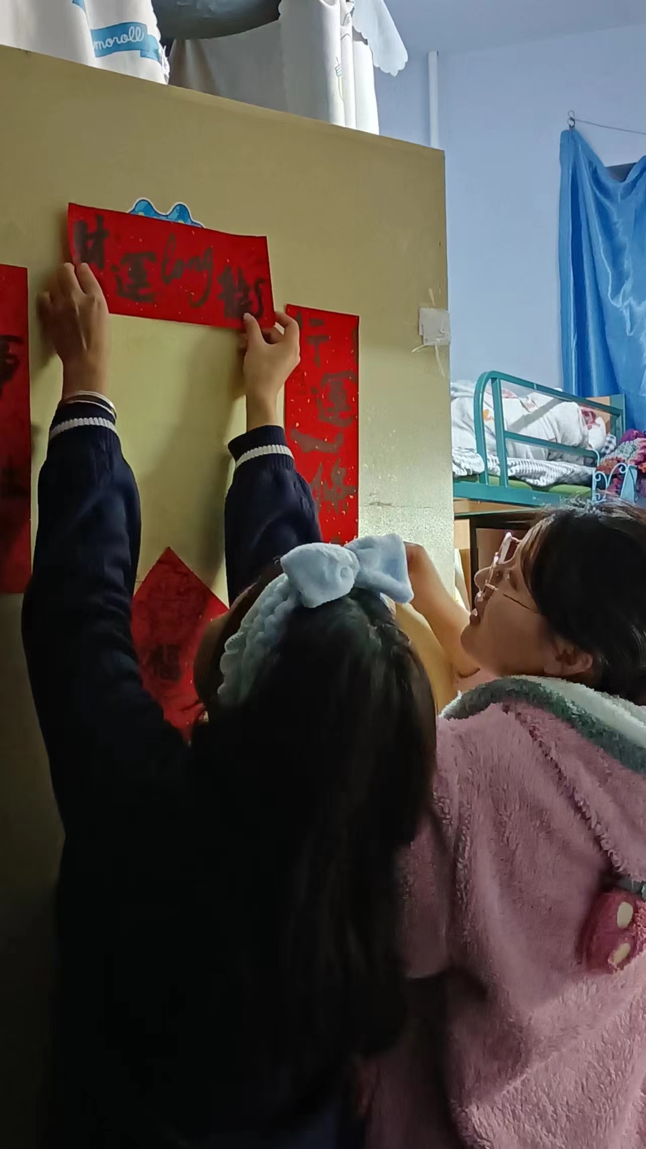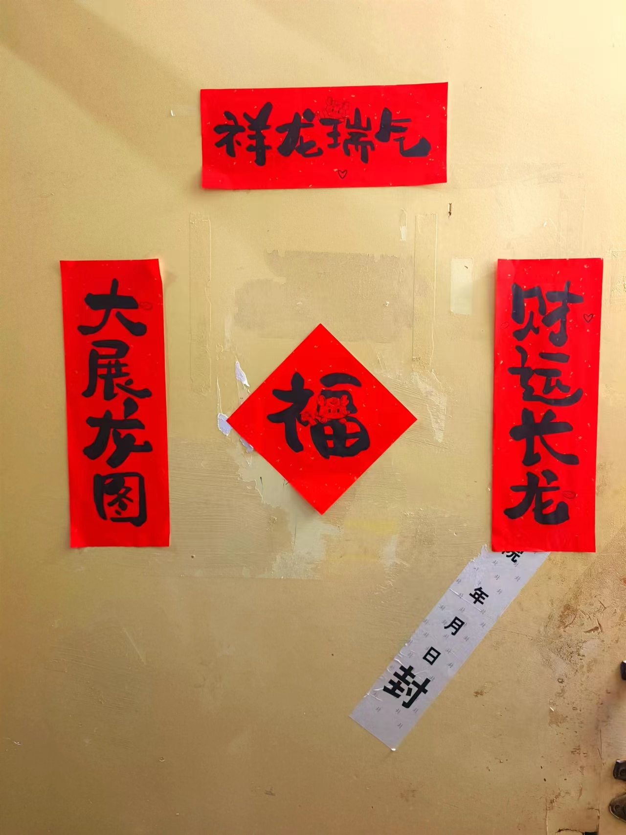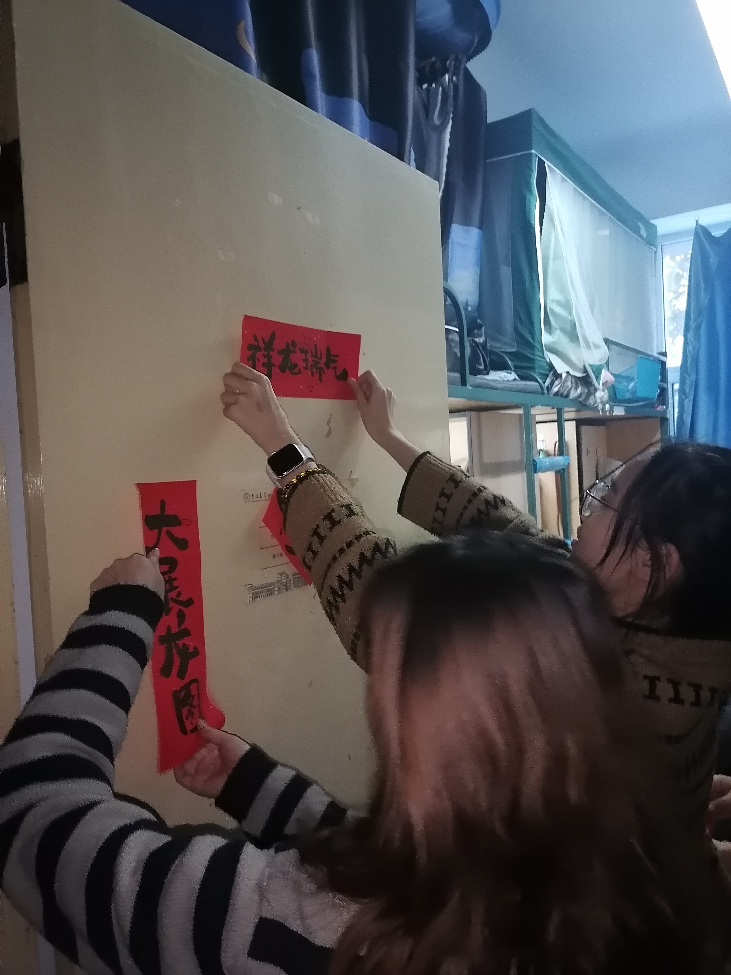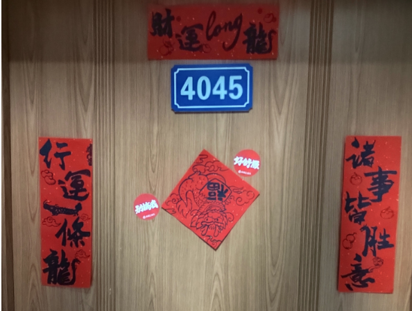 公司员工会和生活管理委员会提前购置了具有“龙”年特色的对联、福字,在各位老师的带领下,同学们纷纷动手贴上寓意着幸福美好的春联。一个个“福”字和拥有美好寓意的春联整齐地挂在门前,寝室走廊被浓郁的节日气息和喜庆的红色铺盖,浓浓的年味扑面而来。