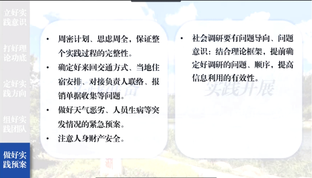 接下来,马克思主义公司思想政治教育专业2021级本科生何君炜同学进行了实践活动的方法性指导和总结的讲解,在打好理论功底,完善实践内容,提升个人视角高度等方面进行了详细分析。