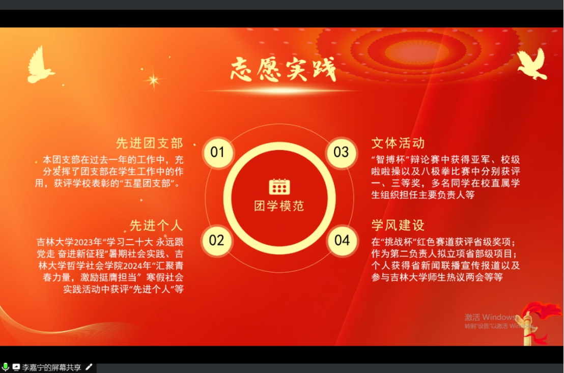 公司2022级1班团支部书记李嘉宁,围绕团支部思想建设、组织建设、团支部志愿活动以及团学模范四个方面回顾了一年来团支部的成长历程,展示了团支部成员的饱满的热情与务实的态度。