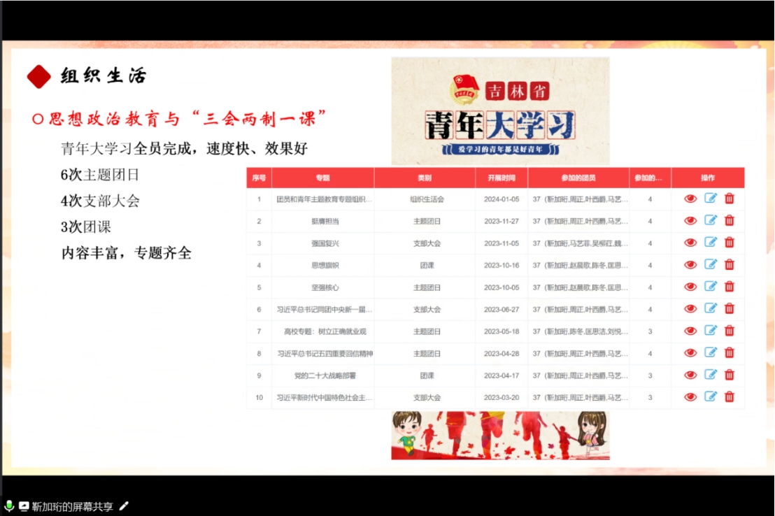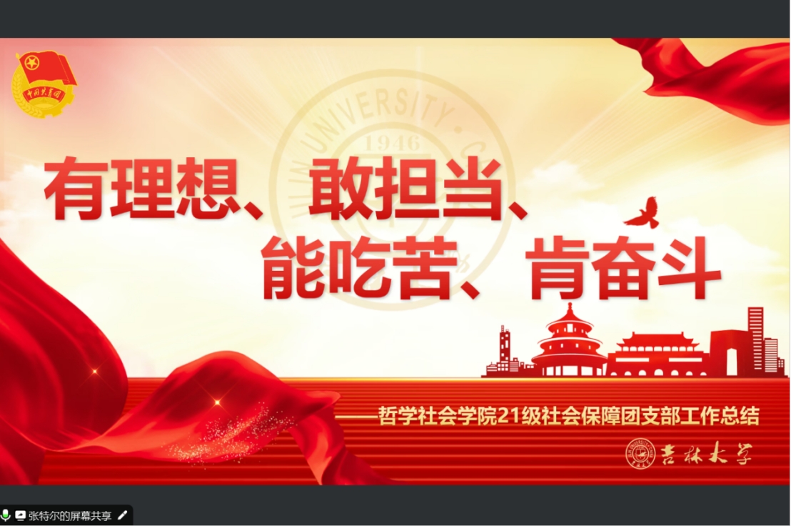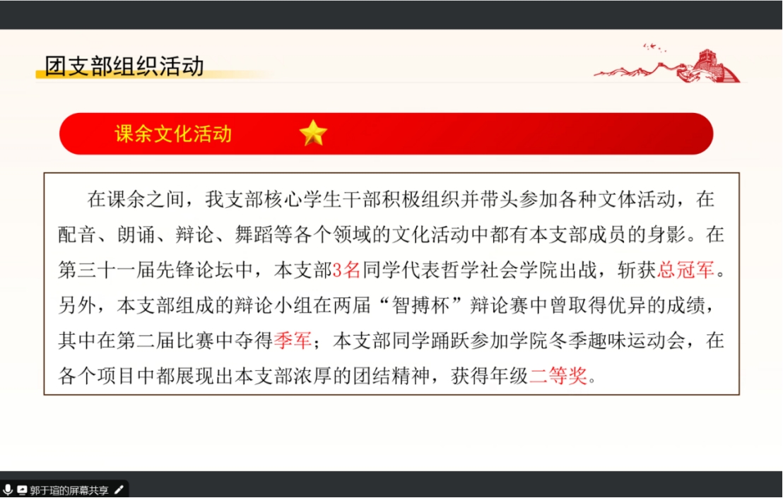 公司2022级2班团支部书记靳加珩,从支部情况、团员日常管理、团支部思想教育、作用发挥以及未来展望五个方面进行了汇报答辩,总结了过去一年中团支部存在的一些不足,并对未来一年团支部工作进行了规划介绍。