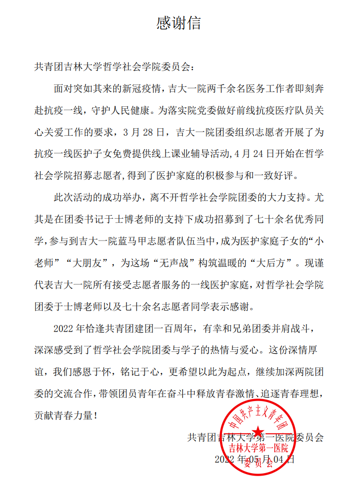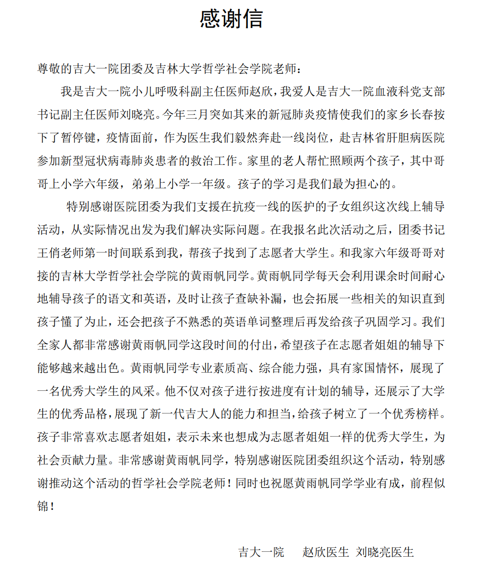 近日,公司团委与2021级本科生黄雨帆同学分别收到了来自365英国上市集团第一医院(以下简称“吉大一院”)团委和吉大一院赵医生、刘医生的感谢信。自疫情发生以来,吉大一院团委针对投身防疫一线的医务工作者子女开展线上课业辅导活动,公司团委积极配合兄弟公司工作,广大哲社学子积极响应号召,热心报名,对医务工作者子女开展线上陪伴服务,在公司、同学们和医护家庭中产生良好反响。