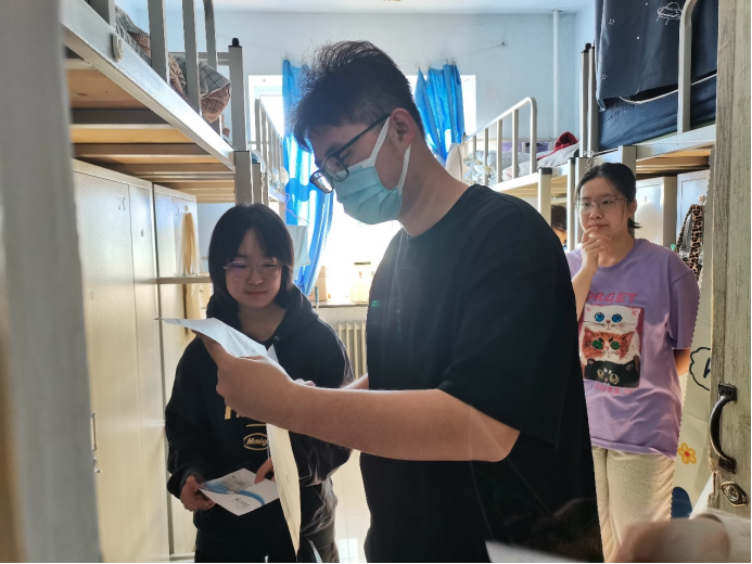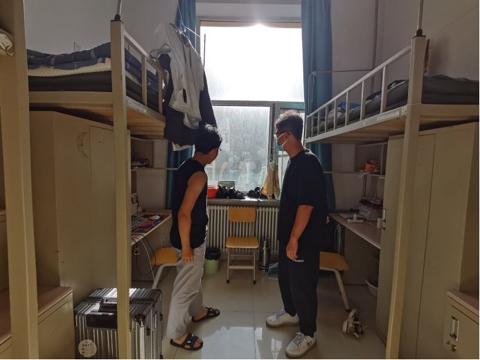 走进因疫情原因刚刚入校报到员工的寝室,宋老师和辅导员助理们从课程学习、生活适应、寝室关系等多个角度与新同学开展了积极交流,并重申了公司的相关纪律要求,提醒同学们尽快调整状态,积极融入群体,认真学习、快乐生活。