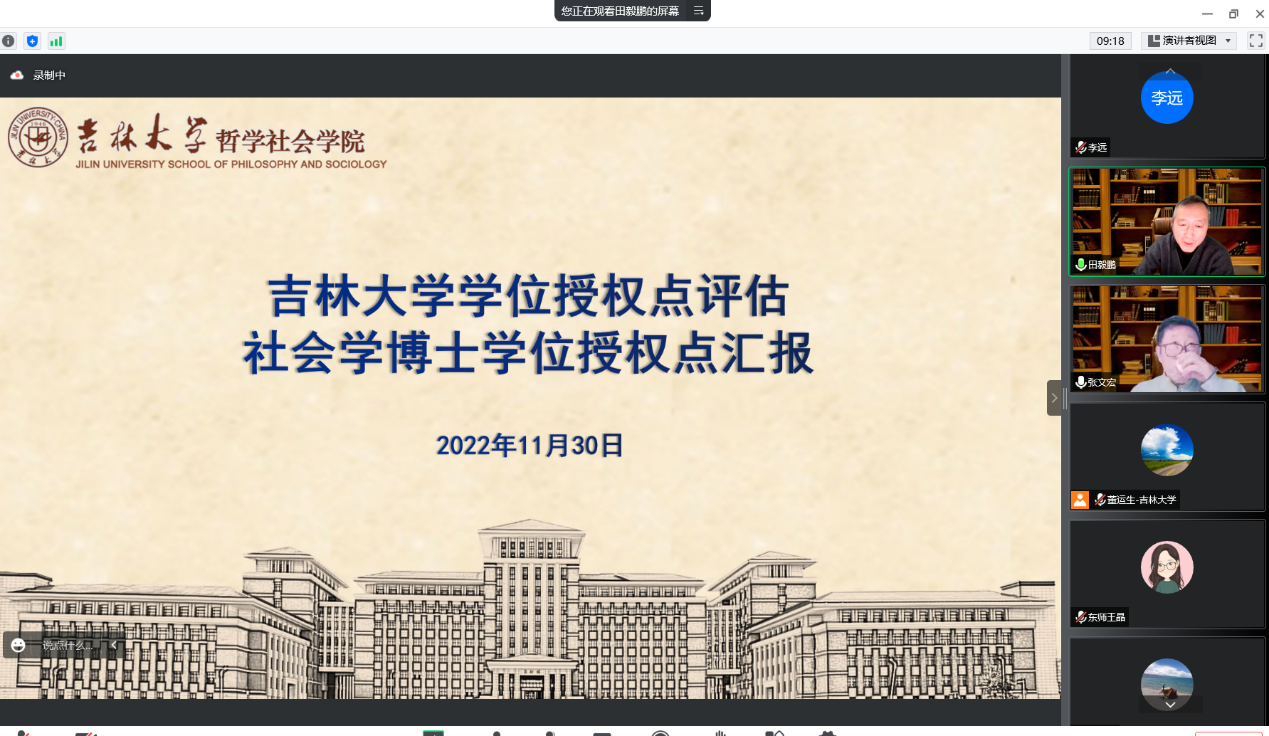 首先,田毅鹏经理代表社会学学位授权点向评估专家组做了详细的学位授权点建设工作汇报。他围绕培养目标与学位标准、学位授权点基本条件、人才培养方式与成效、服务社会经济发展、问题与提升计划展开汇报,系统梳理和总结了社会学学位授权点近五年的工作做法和取得成效,并指出未来将在提高国内外的学术地位和学术影响、提高教学水平和科研能力、发挥学科带头人的关键作用、加强学术梯队建设、加强员工的科学研究和实践训练、加大招生宣传力度等方面提升学位授权点的质量。