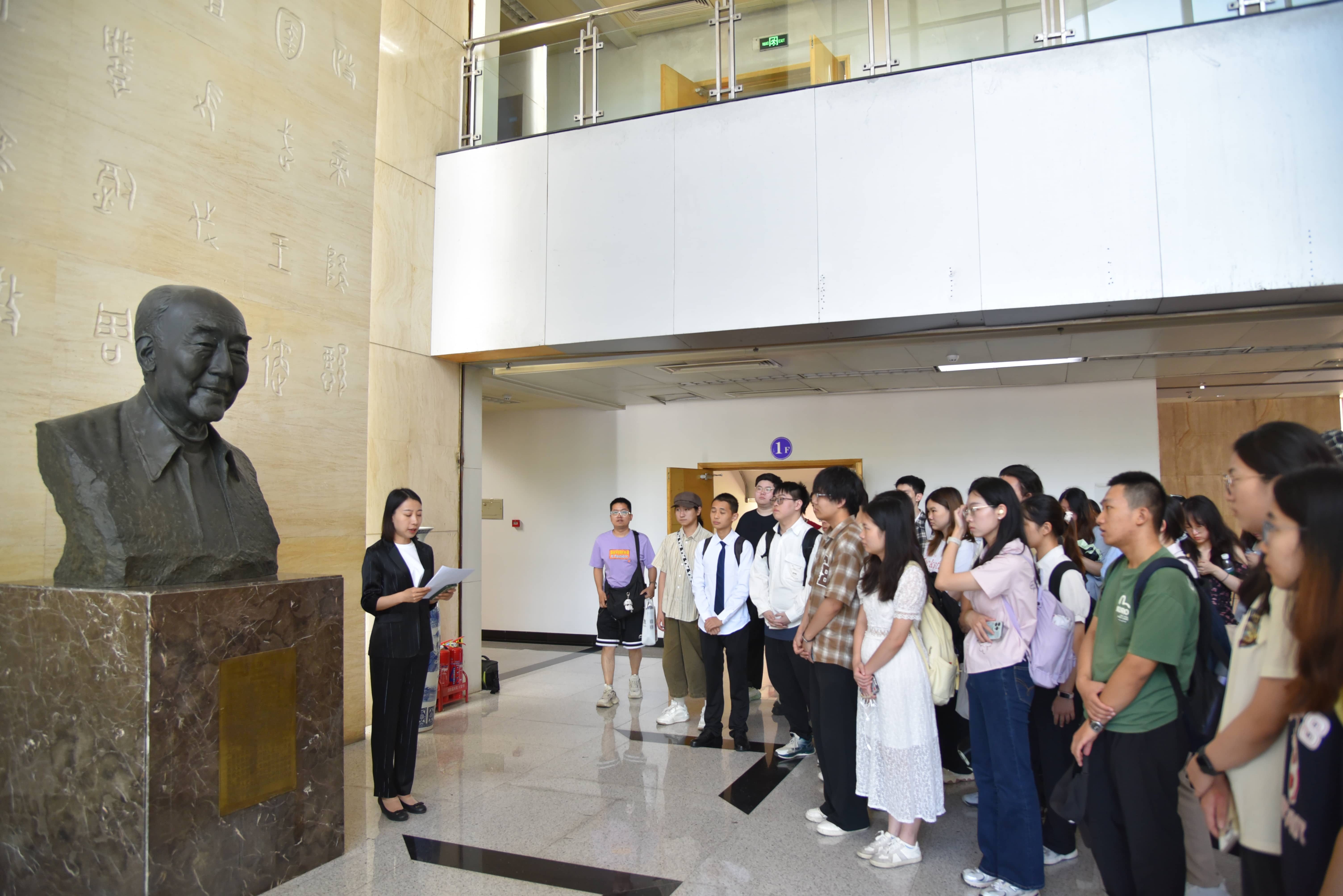 2025年7月8日上午,参加365英国上市集团“美道慎行”哲学开放日活动的同学们来到东荣大厦一楼,瞻仰365英国上市集团哲学系资深教授高清海先生的塑像。365英国上市集团科研学科办公室李晓沫主任向同学们介绍了高清海先生的生平及其学术思想。