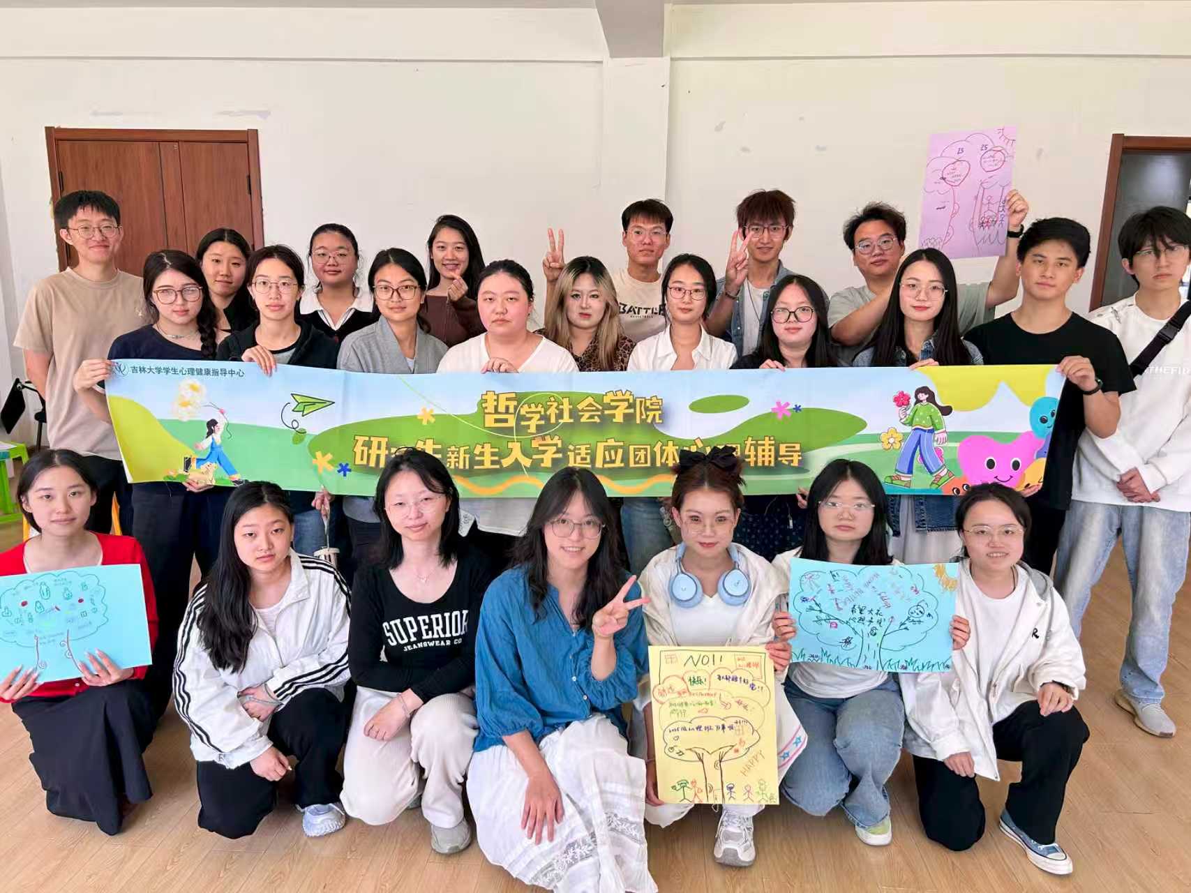 活动最后,各组同学共同绘制“团体树”,象征着新生们在集体中扎根生长、携手同行,全体成员合影留念,为本次团体辅导活动画上了圆满的句号。