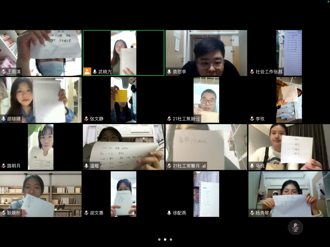 本次线上班会旨在通过有趣小游戏以及同学之间的沟通排解疫情以来封校和封寝带给我们的压抑情绪,拉近同学之间的距离,疫情无情人有情,我们不要为“情”所困,希望在艰难的时光里大家能够学会用平和的心态去面对生活和学习,保持着现在积极乐观的状态!相信人比山高,脚比路长!