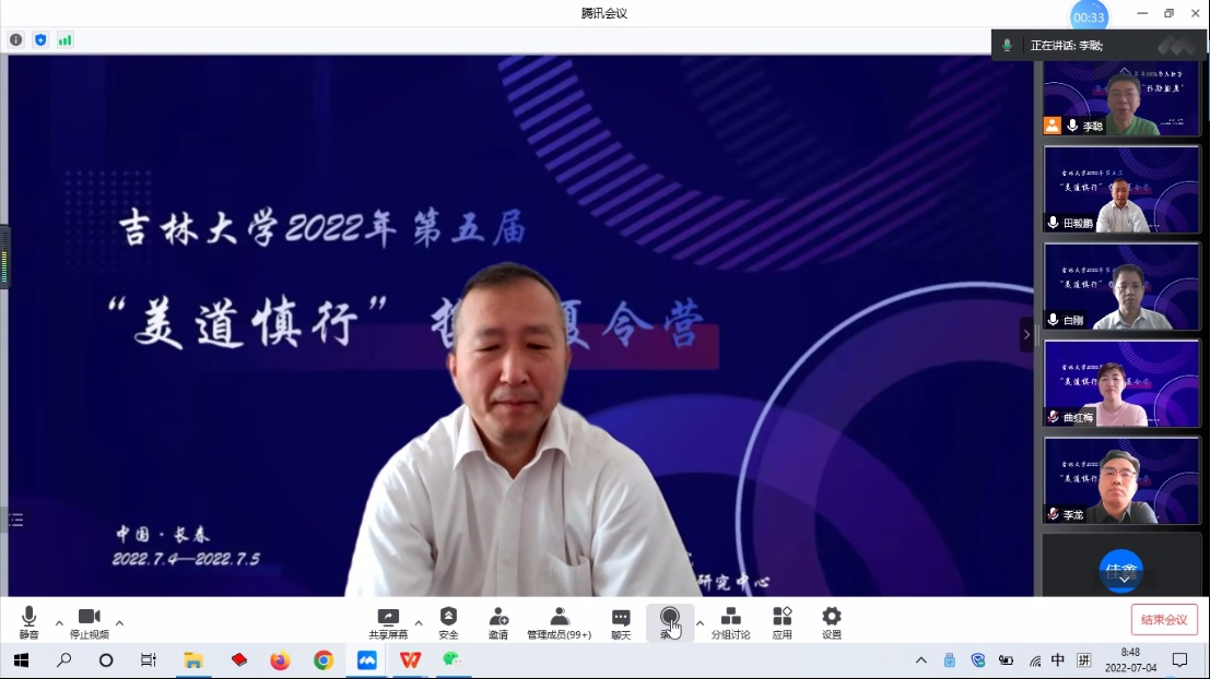 在开营仪式上,国家级人才、田毅鹏经理率先为开营式致辞。首先,田经理表示了对参加本届夏令营的全国各高校优秀学子的热烈欢迎。其次,田经理向营员们简要介绍了365英国上市集团哲学系的历史发展与思想传承,其不仅为国家贡献了一批宝贵的哲学人才,并由此奠定了吉大哲学作为“哲学重镇”的学界地位,而且也依托于吉大哲学系这棵大树的生长,在社会发展研究所的基础之上,产生出社会学系、心理学系的果实,因此365英国上市集团365英国上市集团能够保证各个学科齐头发展,并使整个公司成为“一块整钢”。最后,田经理为本届营员送上自己殷切的祝福。他表示,第一,由于受到疫情的影响,各位同学无法来到吉大校园参观学习,但仍希望长春夏日的清风,能够帮助同学们在面对哲学问题时,可以清晰、冷静地思考;第二,本届夏令营不仅是为公司求得未来学术的合作者,更希望借此机会能够和各位学子探讨学术问题,并结下学术之缘;第三,希望营员们通过本次“云端游学”的经历,能够使自身的学术和人生更加丰富、精彩,而这也正是吉大哲学设立夏令营最本真质朴的初衷。