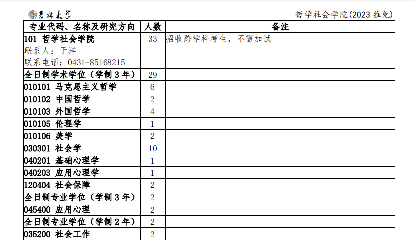 (参见2023年接收优秀应届本科毕业生免试攻读研究生招生简章及专业目录http://zsb.jlu.edu.cn/info/2812.html)