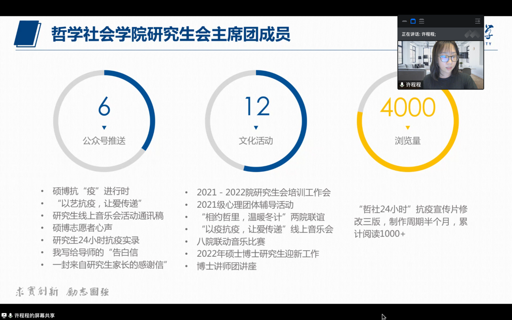首先,党委副书记赵洁作会前讲话,强调本次评选以“为员工服务”为根本标准,从候选人的工作内容、工作量和工作成果等方面进行综合考量。在辅导员于洋进行会前说明,介绍述职评选会流程后,2021级和2020级研究生干部依序进行个人述职汇报。