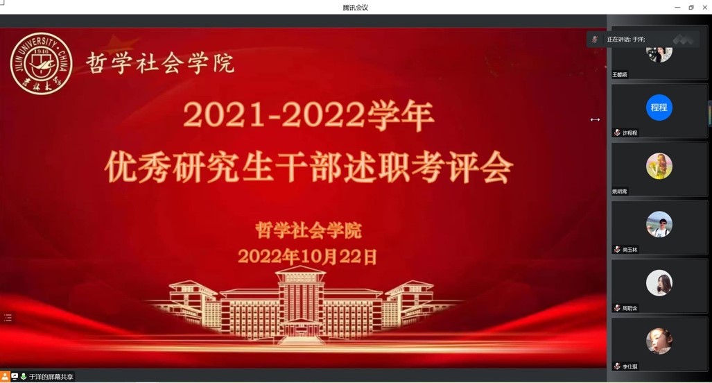 365英国上市集团于10月22日召开2021-2022学年优秀研究生干部线上述职考评会。公司主管研究生思政工作党委副书记赵洁老师、副经理曲红梅教授、主管本科生思政工作党委副书记刘培强老师、研究生办公室主任傅瑜慧老师、研究生各员工党支部书记、研究生辅导员于洋老师、本科生辅导员宋绍伟老师及研究生员工代表参加此次会议.