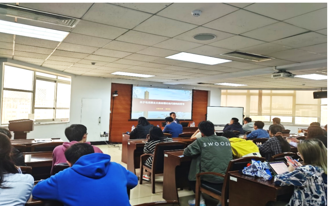 首先,陈培永教授提出做学问需要透过文字表象把握其内容思想,面向文本是青年员工走向学术之路的不二法门,面向时代是青年学者应当努力的方向。围绕“马克思主义自由理论的当代建构”这一主题,讲座内容主要分为四个部分:其一,从“赋权性自由”到“权能性自由”的阐释。陈教授指出不仅要强调人们自由的权利,还要赋予自由的能力,要保障大多数人自由的物质基础,以及自由的身体和生命前提。其二,陈教授通过阐释马克思的经典论断——“人的本质是一切社会关系的总和”,提出将人理解为“关系性个体”,而非“独立性个体”。其三,面对“资本逻辑已经成为制约现代人自由的主要因素”这一社会现实,陈教授提出“公权力塑造”不一定是“必要的恶”,我们需要强有力的“公权力”保障大多数人的自由。其四,借助马克思的共同体思想,陈教授表明只有在“真正的共同体”的基础上,才有可能实现普遍的自由。